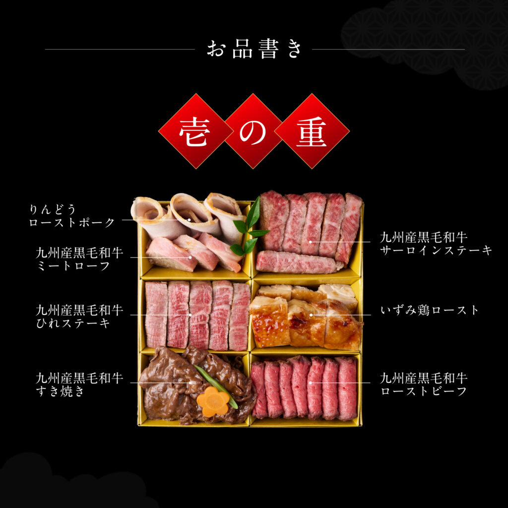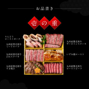 [壱の重 ]九州産黒毛和牛ひれステーキ、九州産黒毛和牛サーロインステーキ、九州産黒毛和牛すき焼き、九州産黒毛和牛ローストビーフ、九州産黒毛和牛ミートローフ、りんどうローストポーク、いずみ鶏ロースト