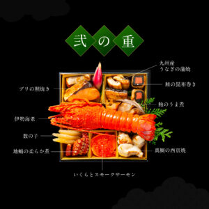 [弍の重]伊 勢 海 老、鮑のうま煮、ブリの照焼き、九州産うなぎの蒲焼、地蛸の柔らか煮、真鯛の西京焼、鮭の昆布巻き、いくらとスモークサーモン、数の子