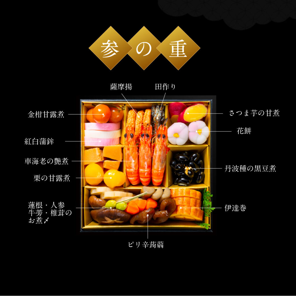 [参の重 ]車海老の艶煮、金柑甘露煮、紅白蒲鉾・薩摩揚・伊達巻、田作り、蓮 根・人 参・牛 蒡・椎 茸 の お 煮〆、ピリ辛蒟蒻、栗の甘露煮、さつま芋の甘煮、花餅、丹波種の黒豆煮