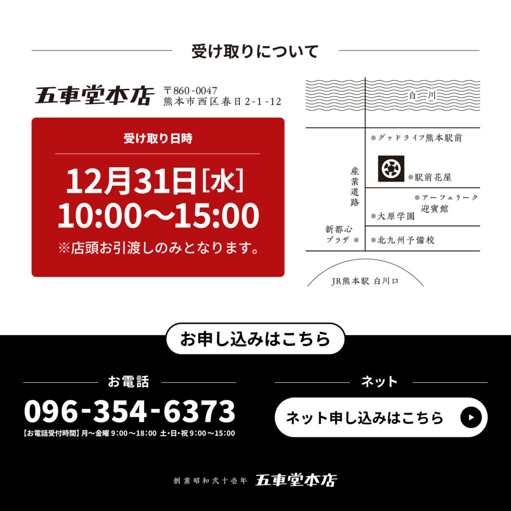 受け取り日時:店頭お渡しのみとなります。 12月31日(水)10:00〜15:00 店頭お引き渡し商品です。(要冷蔵) こちらの商品はご自宅までの配送はいたしませんので、あらかじめご了承ください。
